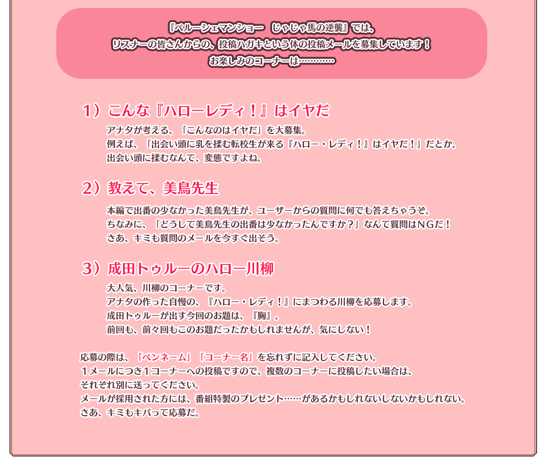 皆様からいただいたご投稿は『ハロー・レディ! - New Division - 』に付属されるドラマCDにて、